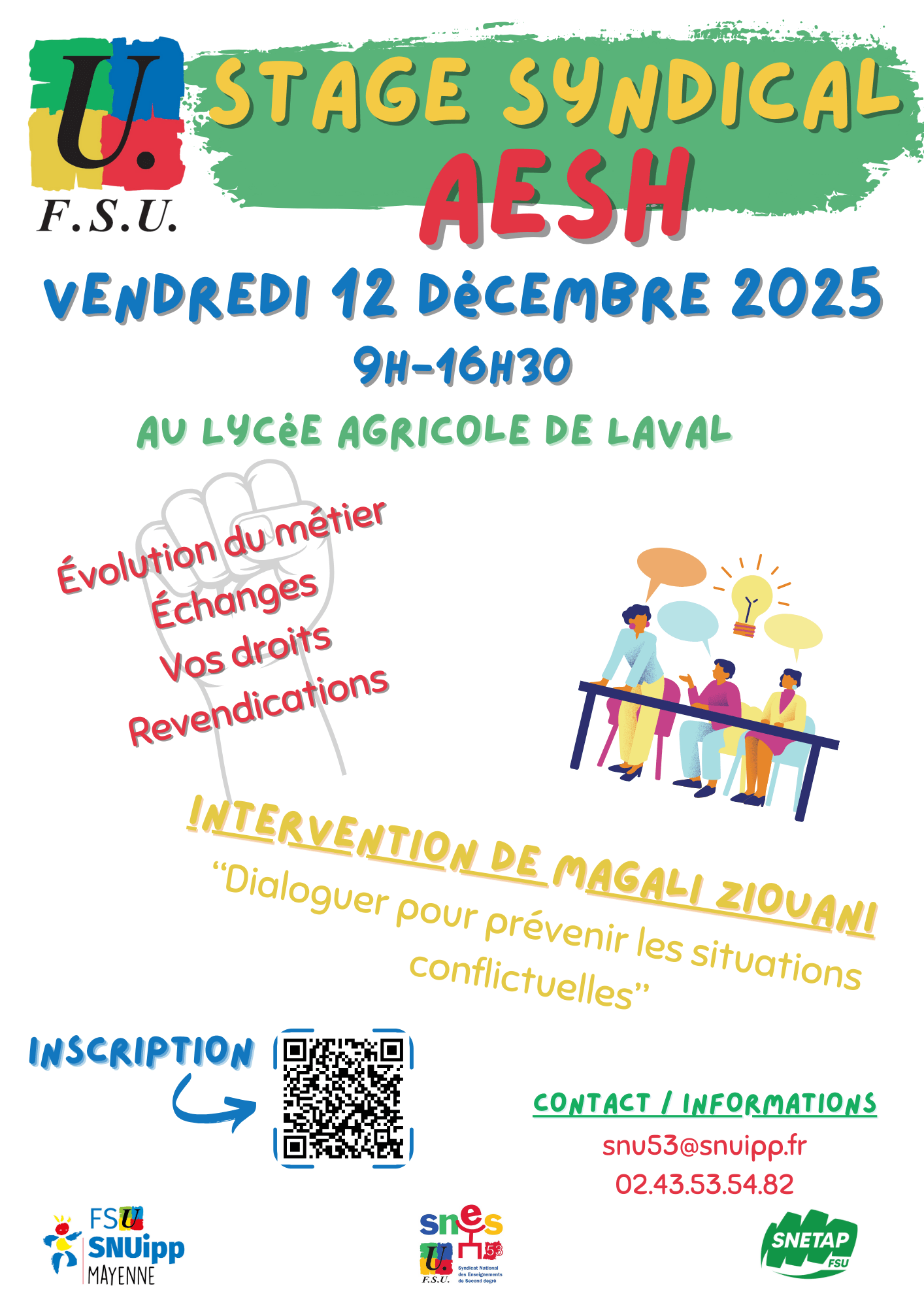 La FSU organise un stage fédéral (FSU-SNUIPP, SNES-FSU, SNETAP) à destination des AESH le jeudi 12 décembre 2025 au lycée agricole de Laval. Date limite d’inscription : 12 novembre (ne pas oublier de donner votre autorisation d’absence) Inscrivez-vous via ce lien : https://framaforms.org/inscription-au-stage-syndical-aesh-1758794098 Pour rappel : chaque agent de la fonction publique a le droit à 12 jours de formation syndicale par an (sans retrait de salaire). Votre [...]